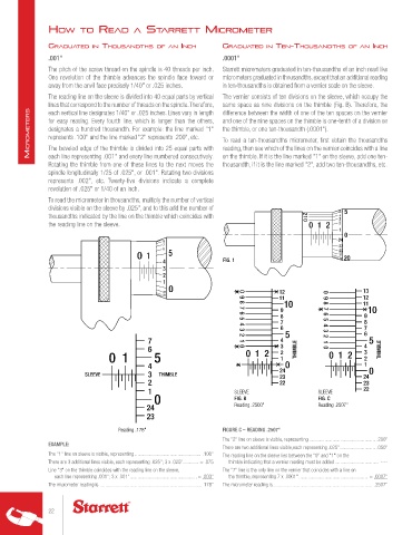 The pitch of the screw thread on the spindle is 40 threads per inch. Starrett micrometers graduated in ten-thousandths of an inch read like